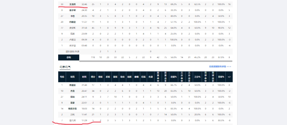 曾凡博比赛中虽仅出现1次失误和2次犯规,但全场正负值-8,球队第二低。