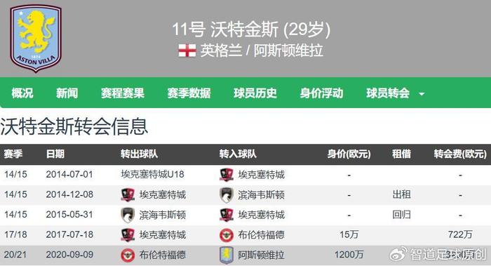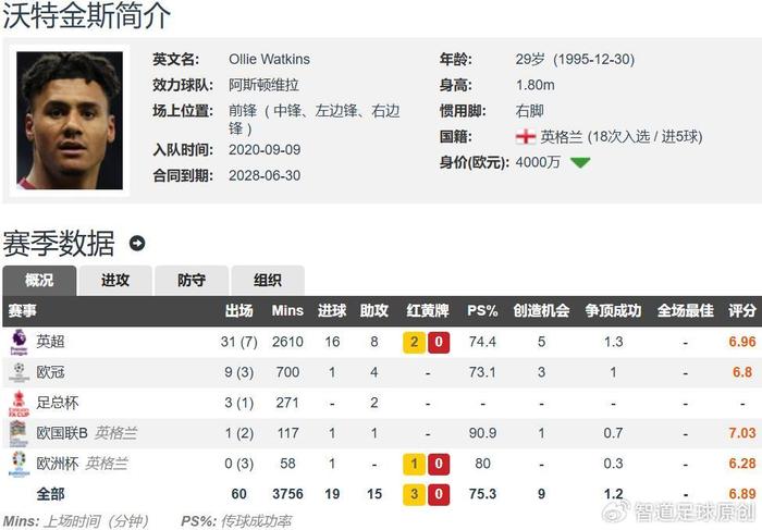 现年29岁的沃特金斯,身高1.80米,右脚球员,主打中锋位置,也可以踢边锋,上赛季各项赛事共为阿斯顿维拉出场54次,其中43次首发,贡献17球14助,准两双球员。