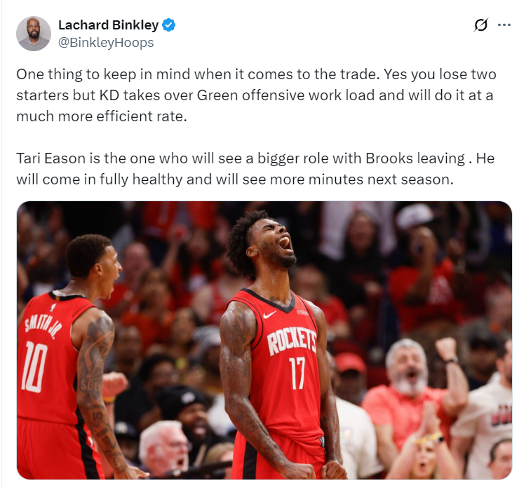 火箭队记兰德里-宾克利的言论也回怼了太阳媒体:虽然我们失去了两位先发球员,但杜兰特会承担球队进攻重任且效率会很高,伊森将成为狄龙离开后防守核心,他将完全恢复健康,新赛季他会得到更多登场时间。