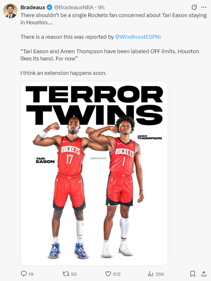 休媒Bradeaux也写道:不应该有任何一位火箭球迷为伊森的去留担忧,ESPN记者布莱恩-文霍斯特已经在节目中说过,阿门与伊森都是火箭的非卖品,休斯顿坚持自己的选择目前无意交易他们,火箭与伊森的续约我相信很快就会谈下来。